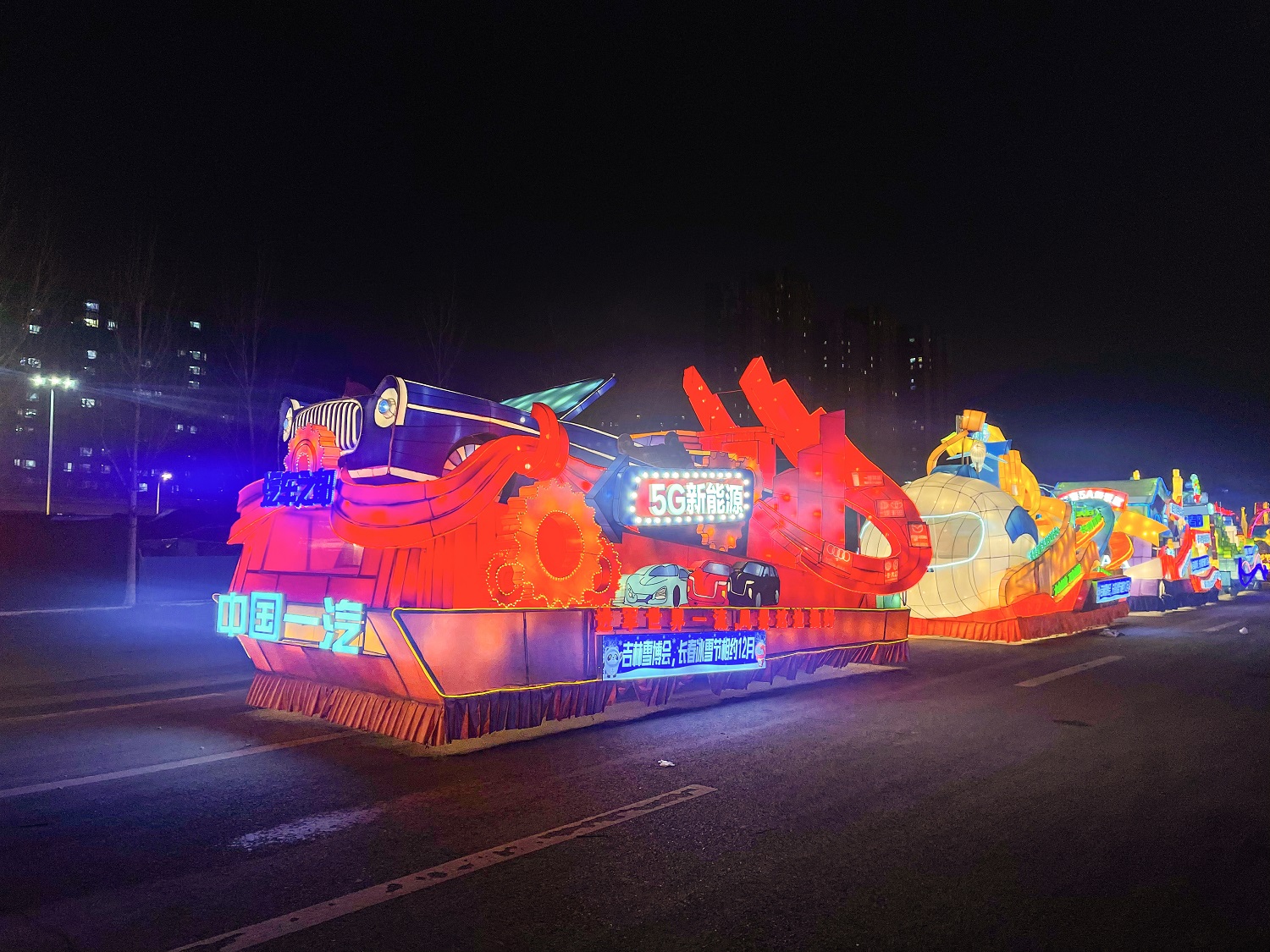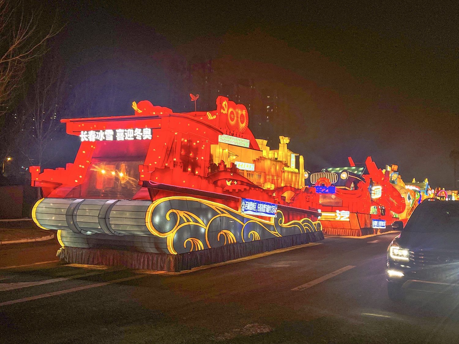 12月11日晚,花车巡游活动在长春国际会展中心东二门正式发车。头车以醒目的“长春冰雪•喜迎冬奥”口号引领,这也是本届长春冰雪节的主题,以都市冰雪致敬冬奥。车身展现的是“庆祝中国共产党成立100周年”主题,主要呈现中共一大红船、天安门、长城、“中国共产党成立100周年庆祝活动标志”,长影、一汽、长春火车站、太阳鸟、吉林长春社区干部学院等元素,歌颂伟大的中国共产党成立100年来创造的丰功伟绩,进一步激发广大人民群众热爱党、热爱祖国、热爱家乡的热情。第二辆是“现代化都市圈”主题花车,体现长春速度,以抽象与具象相结合的方式,展现长春市高质量发展的“四大板块”,通过具象的长光卫星、高铁、飞机等元素展现长春科技创新发展的速度,抓创新就是抓发展,谋创新就是谋未来,以创新引领,开放崛起,在国家区域创新中心中争当辐射带动的“新高地”。