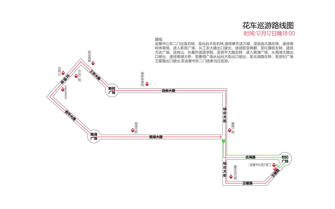 本次花车巡游路线沿途经过长春市各大繁荣街道和商圈,提高曝光度。11日晚,花车巡游队伍途经摩天活力城、人民大街、香格里拉大酒店、卓展、活力城、长春动植物园、长春体育中心、经开希尔顿酒店等地,以重庆路商圈和长春繁华街路为重点,在夜幕中形成一道炫目的风景线,在寒冷的冬季带给广大市民最丰富的视觉盛宴。12日,长春冰雪节开幕式当晚,花车巡游队伍途径南岭体育场、欧亚商都、万达广场、这有山、长春外国语学院、南湖广场等场所,以红旗街商圈为重点,让喜欢购物一族欢乐加倍。此轮花车巡游活动,让百姓无论是在冰雪新天地开幕式现场,还是在城市街路,都能感受到长春冰雪节的欢乐氛围。