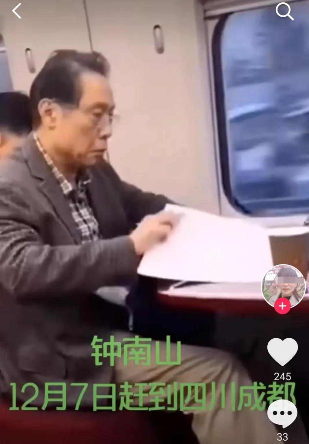 一位网名发布的视频中,疑似钟南山院士的男子在火车上,字幕称“12月7日钟南山赶到四川成都”。